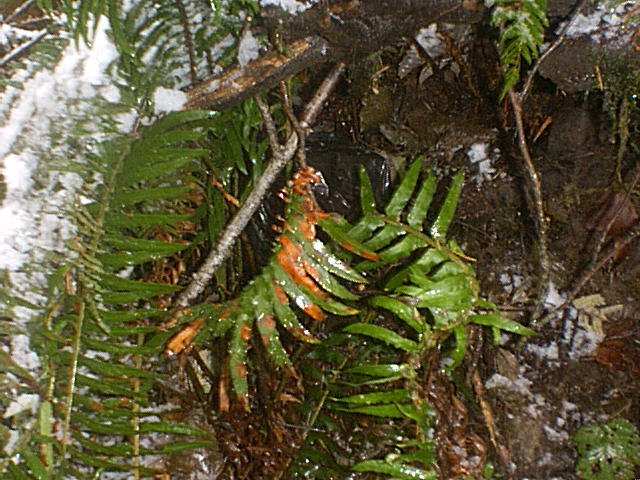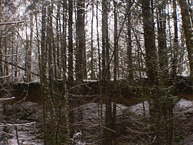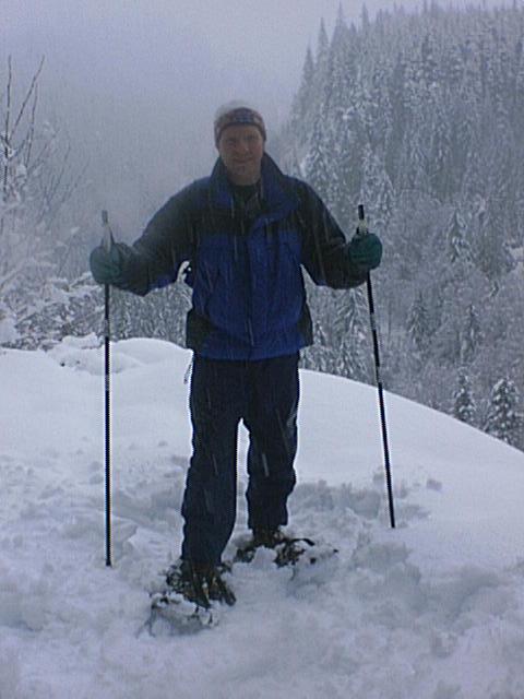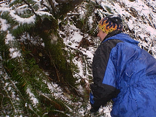 On December 15, 2001, Seth! and Jon (Moun10Bike) went to the Mt. St. Helens area to hide a special geocache: a miniature replica of the original case. The geocache is a multi-cache, with the first stage hidden within the area described by the original ad. Here you will find a clue that provides coordinates for the physical geocache. Although we did not spot Bigfoot, we saw several deer and found a partial log cabin. Bigfoot's feeding ground, indeed. There was a lot of snow on the ground, so we chose to head in on snow shoes. This proved to be a very good choice. (See photo of Seth! at left.) The geocache is posted on geocaching.com. A few additional photos, including spoilers, are provided herewith.