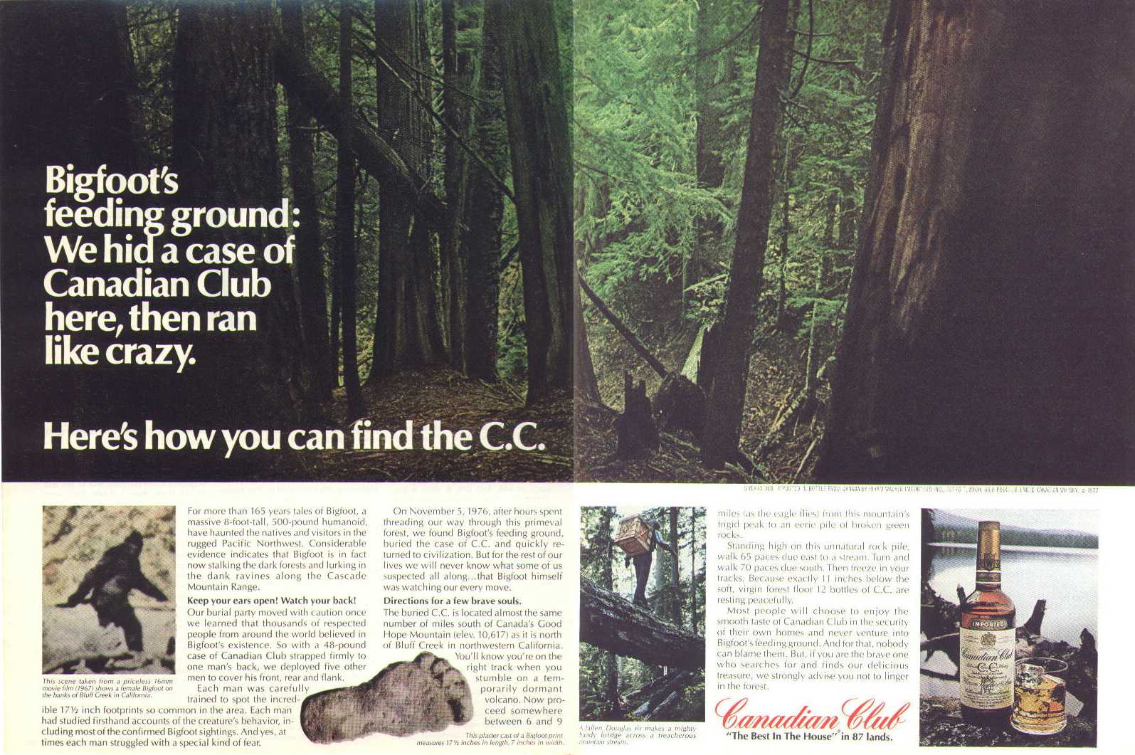 Most people will choose to enjoy the smooth taste of Canadian Club in the security of their own homes and never venture into Bigfoot's feeding ground. And for that, nobody can blame them. But, if you are the brave one who searches for and finds our delicious treasure, we strongly advise you not to linger in the forest.